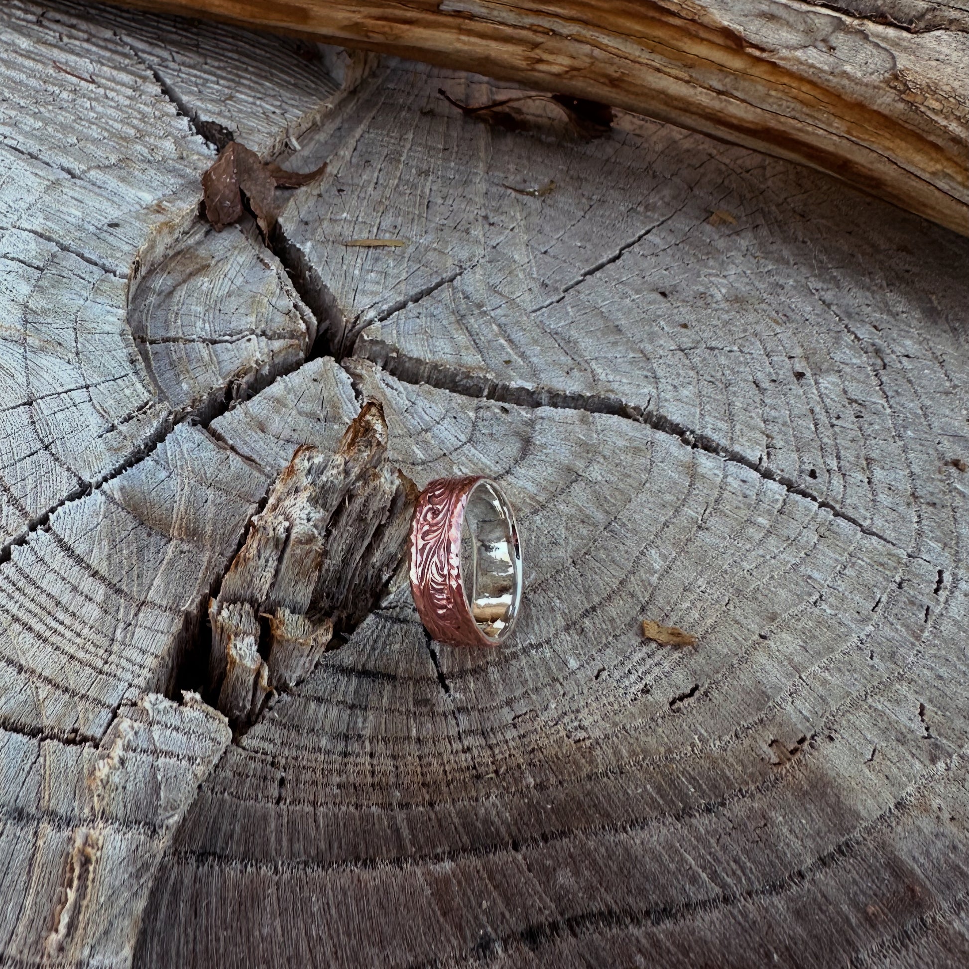 This 2-tone, copper/silver engraved ring brings that something special to your life. Designed with delicate engraving and can be customized with that little something special. Made to order.