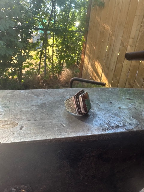 Turquoise on an engraved sterling silver wide band, sz 10.5